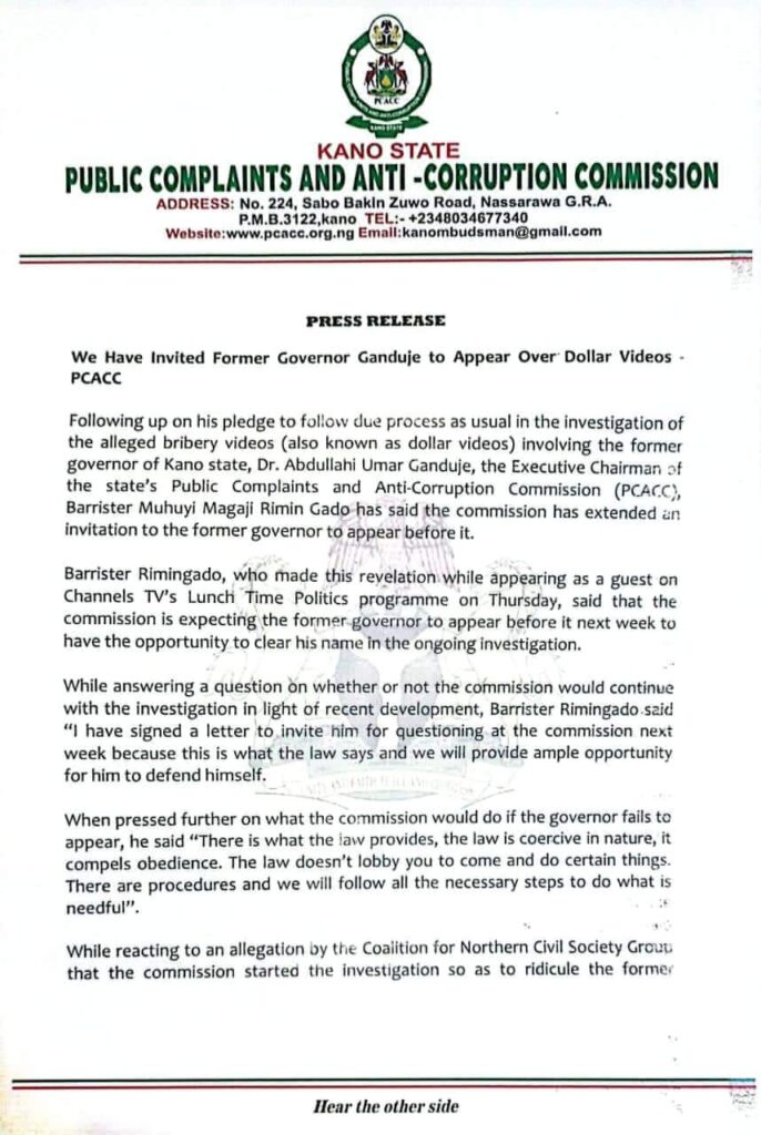 Hukumar karbar korafe-korafe da yaki da cin hanci da rashawa ta jihar Kano ta gayyaci tsohon Gwamnan jihar Abdullahi Ganduje bisa bidiyon Dala.