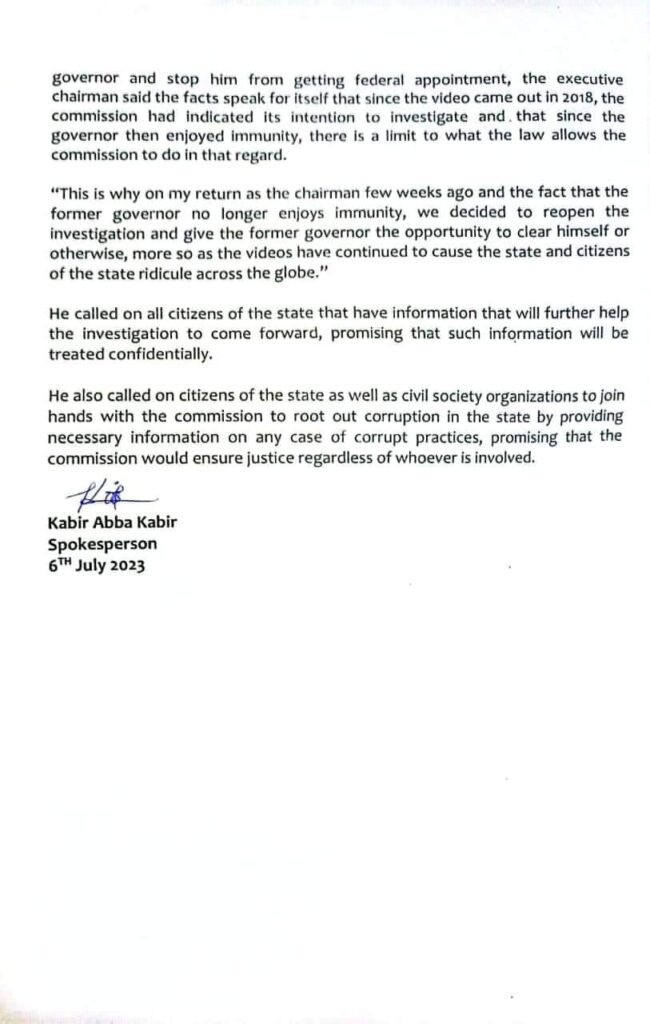 Barr Muhyi Magaji Rimin-Gado shugaban hukumar yaki da rashawa ta jihar a ranar Laraba ya ce binciken kwakwaf ya tabbatar da sahihancin bidiyon.