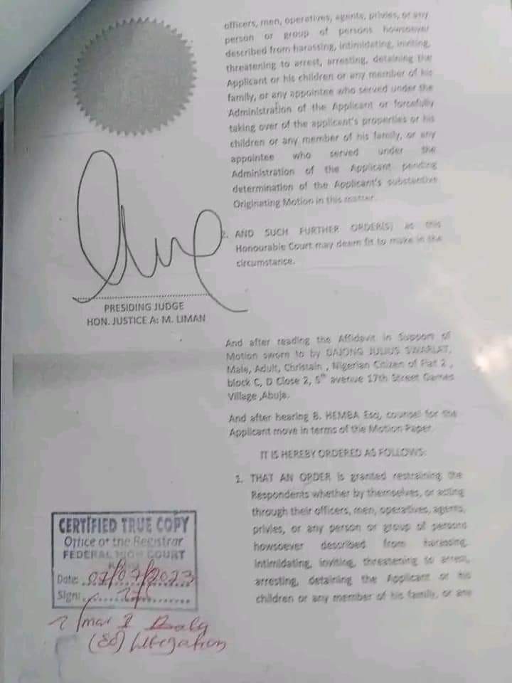 “Wadanda ake kara ko su da kansu, ko kuma ta hanyar jami’ansu,jami’ansu, jami’an tsaron su, masu zaman kansu ko wani mutum ko gungun mutane kar su musgunawa, tsoratarwa, gayyata, barazanar kamawa, ko tsare wanda ya shigar da korafi, ko ‘ya’ya ko wani daga cikin danginsa, ko duk wanda aka nada wanda ya yi aiki a karkashin kulawar mai korafi ko kuma ya karbe kadarorin mai korafi da karfi ko ‘ya’yansa ko wani daga cikin danginsa, ko duk wanda aka nada wanda ya yi aiki a karkashin gwamnatin mai korafi har sai an yanke hukunci a kan neman hanawar”. A cewar umarnin kotun