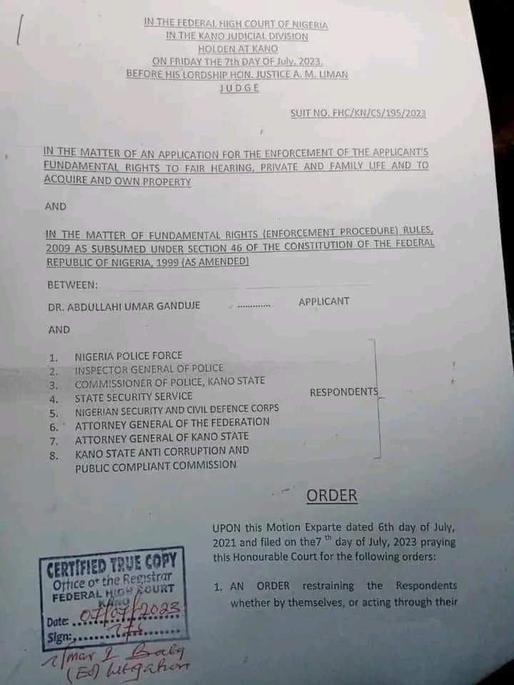 Wata babbar kotun tarayya da ke zamanta a Kano ta hana gwamnatin jihar Kano da jami’anta da ƴan sanda da DSS dai sauran hukumomin tsaro daga kama tsohon gwamnan jihar, Abdullahi Ganduje da duk wasu makimusantan sa.