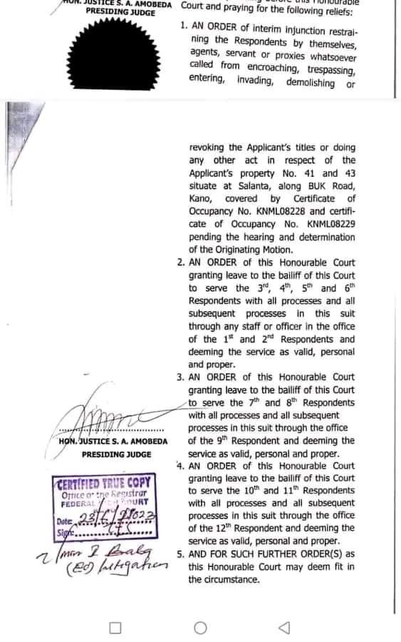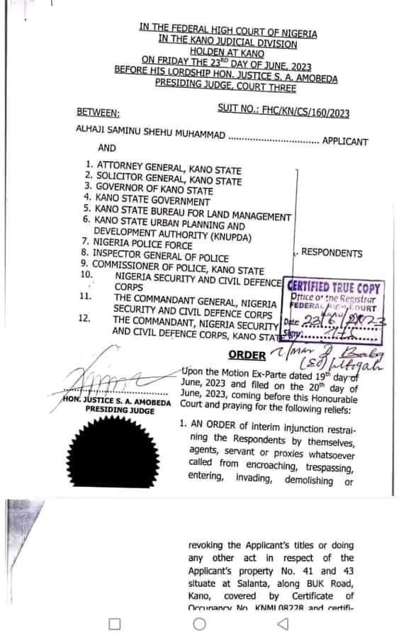 Wata babbar kotun tarayya da ke zamanta a Kano ta hana gwamnatin jihar Kano rusa ko sokewa ko kuma keta ginin gidan Alhaji Saminu Shehu Muhammad da ke no. 41 and 43 Salanta kan titin BUK.